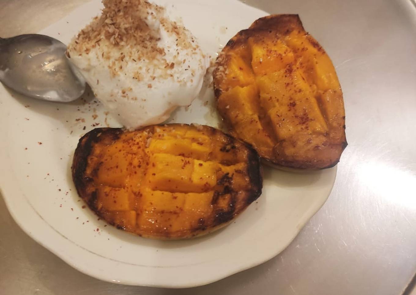 - Serve hot grillled mango with chilled vanilla icecream garnished with coconut shreds and badam flakes
