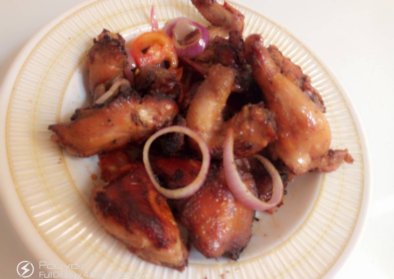 - Greese your oven tray with oil add seasonings to the chicken and put in d oven to grill for 20_30 minutes,when it is almost done slice some onions and tomatoes,and enjoy