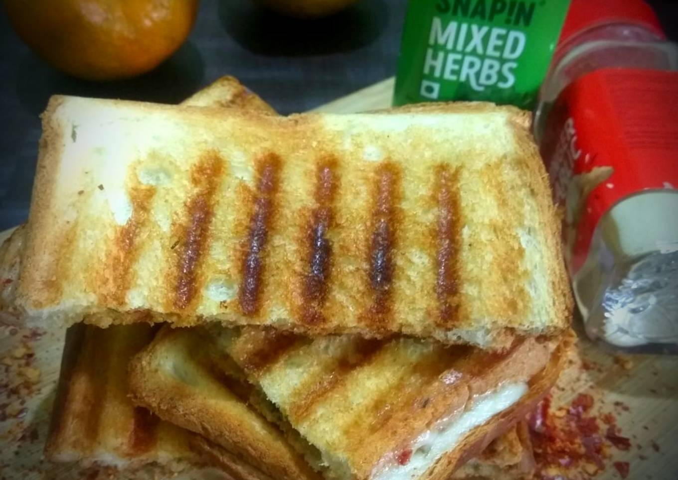 - Sprinkle chilli flakes and mixed herbs. Apply butter on remaining bread.