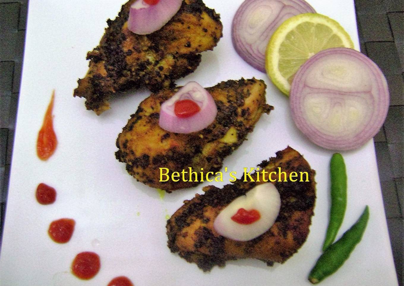 These Pepper flavoured grilled chicken are great appetizers at any small in-house party with family and friends. Spicy and tangy with some extra dash of lime, they will lift up your spirits. So come relish these delicious and healthy snacks with some onion rings, green chilies and sauce. They can also be served as a light meal along with some salads or soup.
